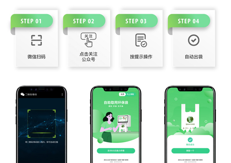 自助取袋機(jī)/環(huán)保袋發(fā)放機(jī)可以自助領(lǐng)取環(huán)保袋,居民可以免費(fèi)領(lǐng),操作和無(wú)人自助售貨機(jī)一樣的。拿出手機(jī)掃碼一下二維碼,機(jī)器自動(dòng)吐出環(huán)保袋。生活上對(duì)居民的出行提供了很大的便利,也通過(guò)免費(fèi)領(lǐng)的方式增強(qiáng)了人們生活中綠色出行、低碳環(huán)保的意識(shí)。大尺寸的觸摸屏和環(huán)保袋同時(shí)也是廣告載體,能夠?yàn)楦鱾(gè)區(qū)域商戶定制設(shè)計(jì)不同廣告,給人視覺感受。每一個(gè)機(jī)器和購(gòu)物袋在使用過(guò)程中相當(dāng)于人形廣告牌。